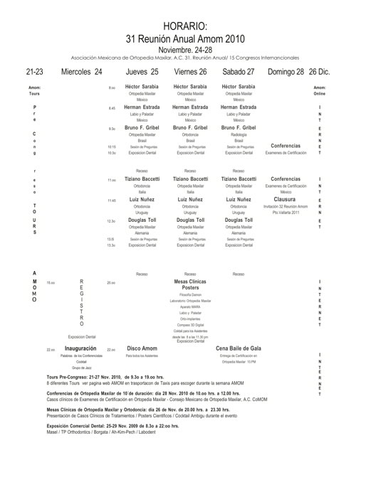 Registro: Miércoles 24 de Noviembre del 2010 de 3.pm a 10.pm. al terminar. Inauguración al Congreso de 10-12.pm, con Cocktail /Ambigü Area de Alberca. Horario: Congreso Jueves 24 al Domingo 28 del .2010 de 8.00-13.00 Sábado 27,Cena Baile: 21.00 pm a 2.00 am. Entrega de Certificación en Ortopedia Maxilar . Consejo Mexicano de Ortopedia Maxilar, A.C. Ortogamiento de 1 Beca para Curso de Ortodoncia de NYU en USA de 3 días Mesas Clínicas / Posters: Viernes 26 de 10 a 12pm Consejo Mexicano para la Certificación en Ortopedia Maxilar, A.C.